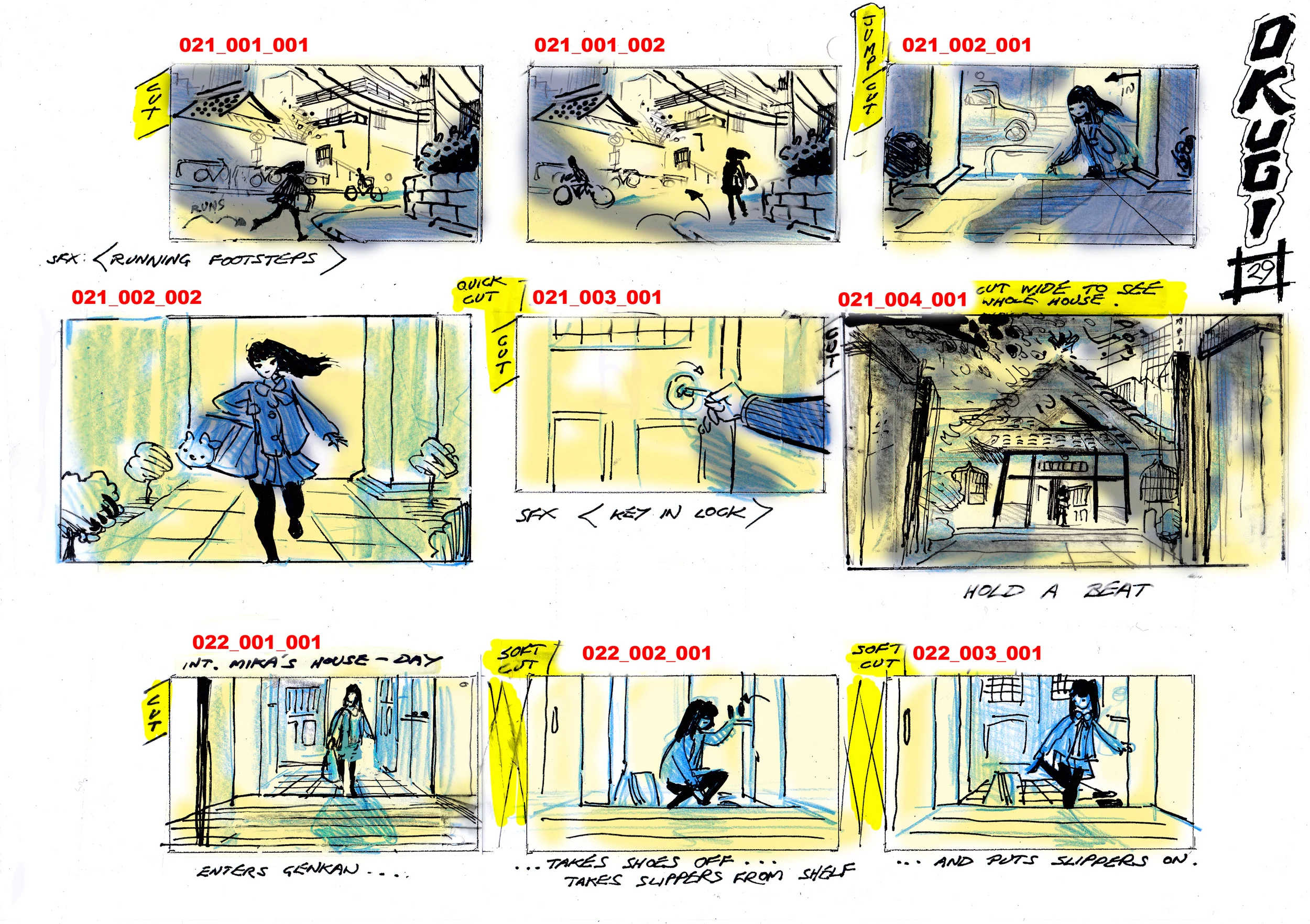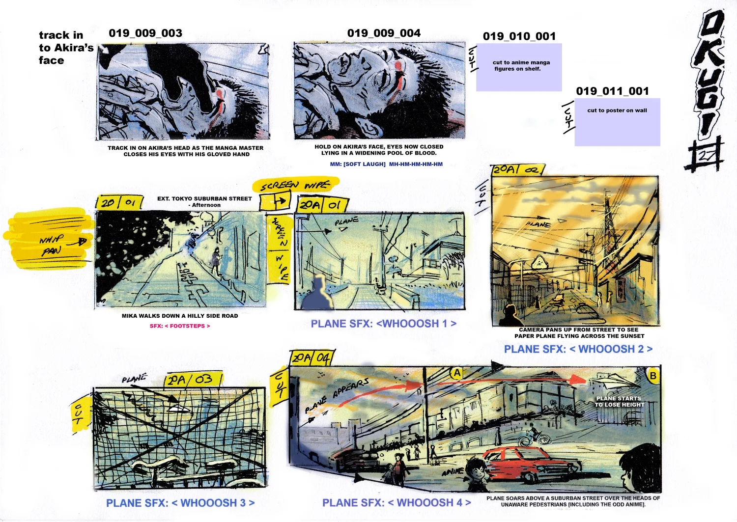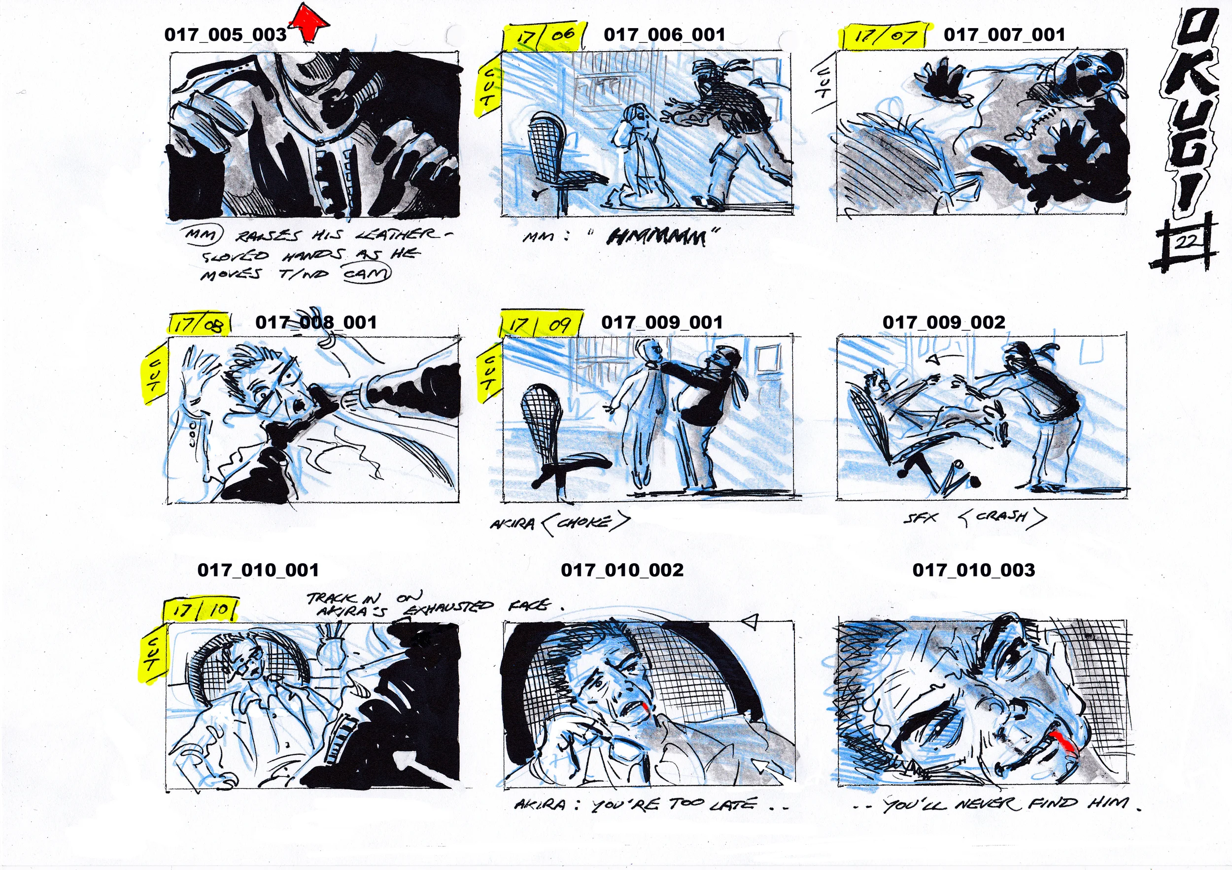 Thumbnails and artworked panels for an animatic - part of a promotion for a proposed feature film combining live-action and anime.
